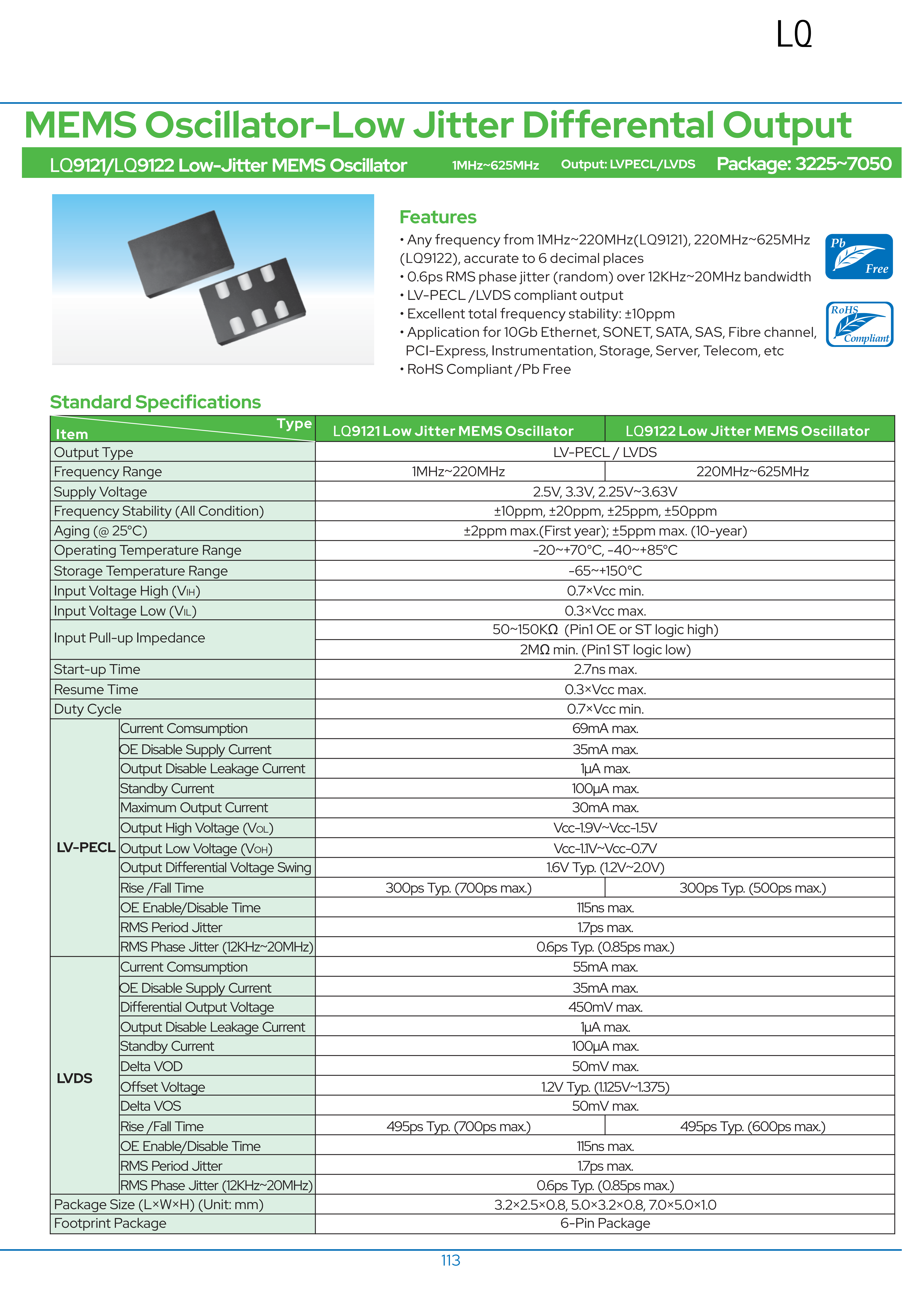 1. 采用标准贴片6针封装MEMS差分振荡器:3.2×2.5(3225),5.0×3