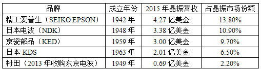 精工爱普生公司(Seiko Epson Corporation)是全球顶尖的贴片晶体振荡器、谐振器制造商;爱普生拓优科梦(Epson Toyocom)将进一步究极用精微加工发挥“石英”材料的优越性能的“QM”技术,创造出体积更小、更高性能或全新功能的电子元器件,晶振年销售额达10亿,其晶振销量在2011年属全球第一;爱普生晶振以32.768KHZ晶振称霸晶振行业,主要消费在手机,PCB,等电子产品。同时爱普生以提供原子钟的精准振荡器知名业界。爱普生晶振在KHZ、MHZ、以及GHZ上都有重大突破,使得爱普生拓优科梦的晶体元器件已以23%的市场占有率位于业界第一。