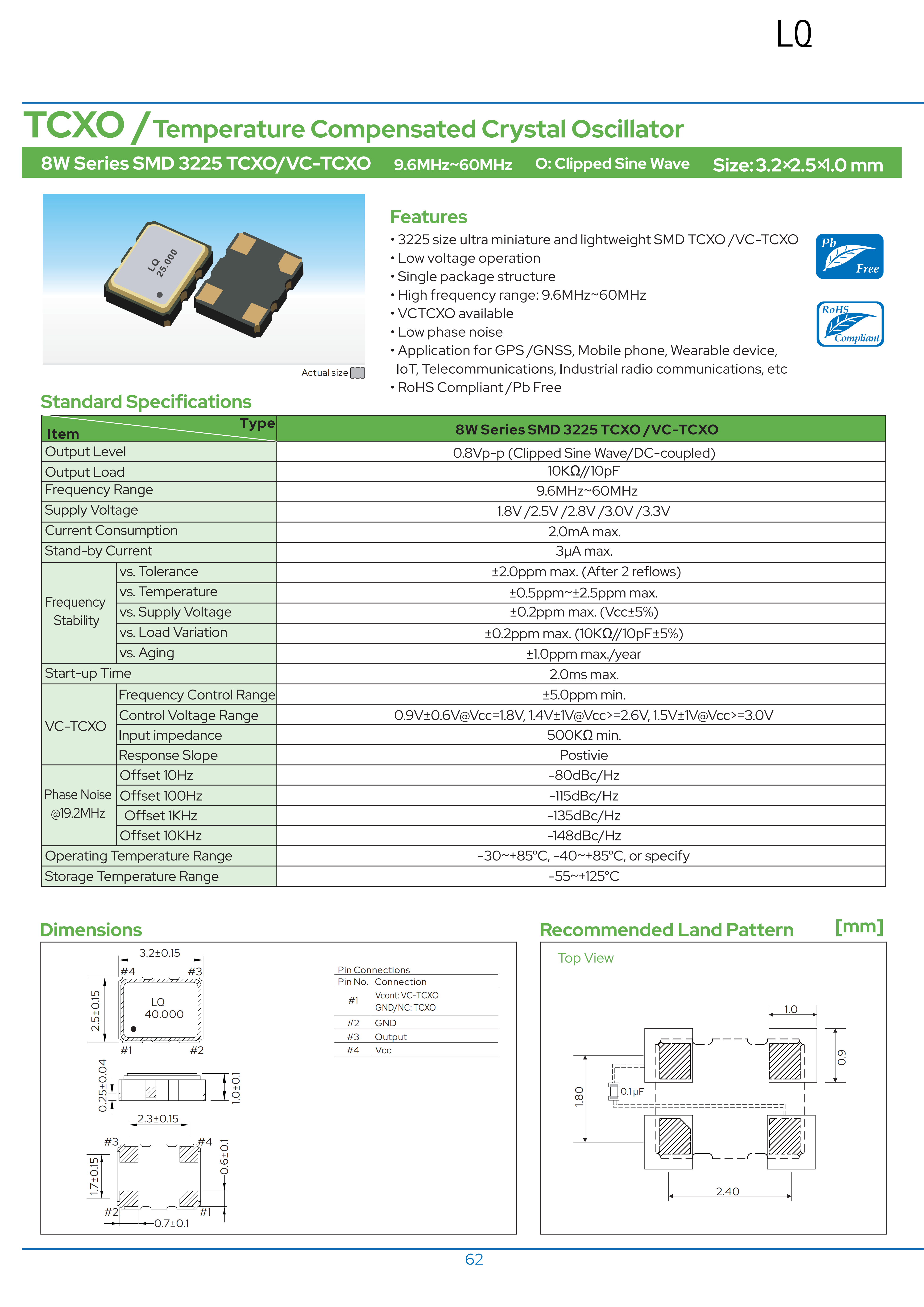 1. 超小尺寸温补晶振贴片SMD 3225封装, 3.2×2.5×1.0mm